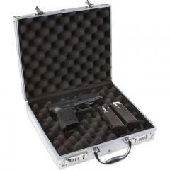 Features aluminum frame, 2 combination locks and foam inserts to protect guns from damage. Measures 11-3/4" x 3" x 10-1/2". Not childproof. Gift sleeved.
